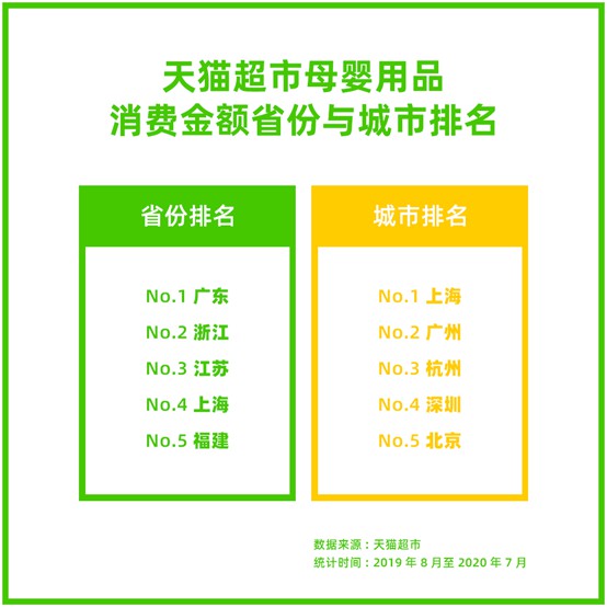 从城市消费规模来看,三线及以下城市的90后、95后通常比一二线城市的同龄人更早成为父母,母婴用品整体消费规模超过一二线城市。而在80后人群中,一二线城市的父母母婴用品消费依然高于三线及以下城市。但整体来看,广东、浙江、江苏等东部沿海各省市依然是天猫超市母婴用品消费金额最高的地区。