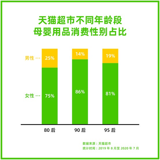 具体数据显示,2019年8月至2020年7月, 80后、90后、95后男性在天猫超市母婴用品上消费的占比分别为25%、14%、19%。而通过天猫超市购买母婴用品的95后人数增长最为迅速。