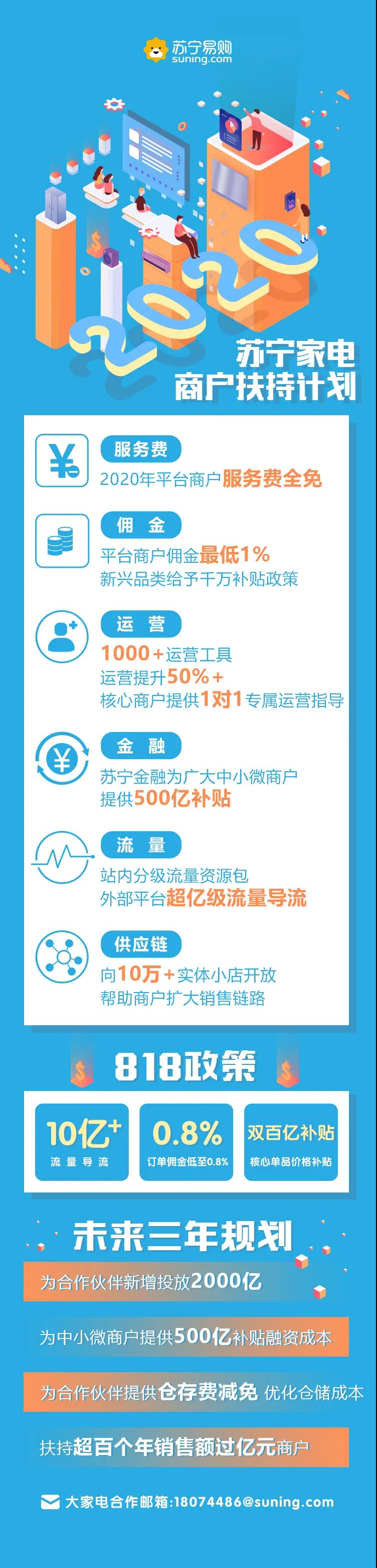 苏宁宣布,2020年苏宁将免收平台商户服务费;向中小微商户提供500亿补贴融资成本,帮助商户缓解资金压力;平台上的商品供应链会向苏宁生态中10万+实体小店开放,帮助商户扩大销售通路。同时,大家电行业线将持续给平台商户匹配站内外的亿级流量,并通过星河生态赋能平台开放1000+运营工具,针对核心商户提供1对1专属运营指导,借此帮助商户有效提升经营效率,降低运营成本。