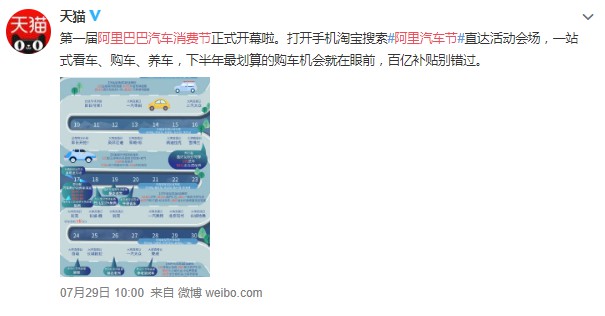 7月29日,“第一届阿里巴巴汽车消费节”正式启动。为了这个节,阿里巴巴旗下天猫、淘宝、支付宝、高德四大“国民App”联合助阵,甚至第一次将汽车纳入“百亿补贴”范畴。