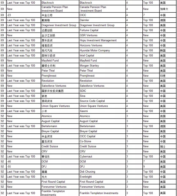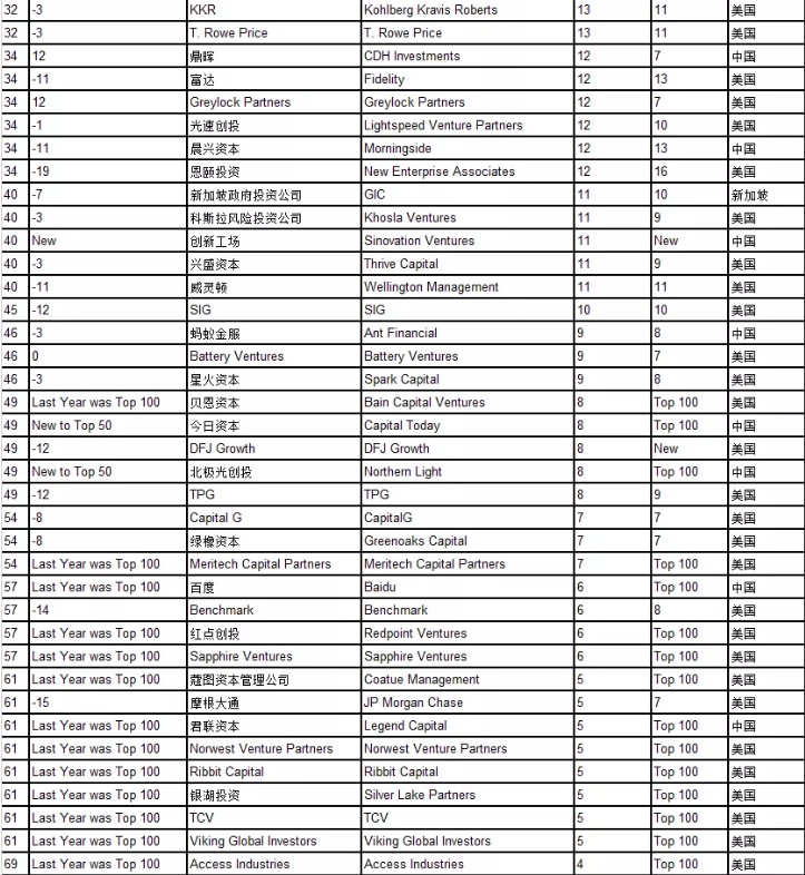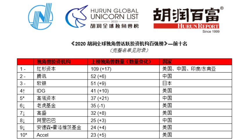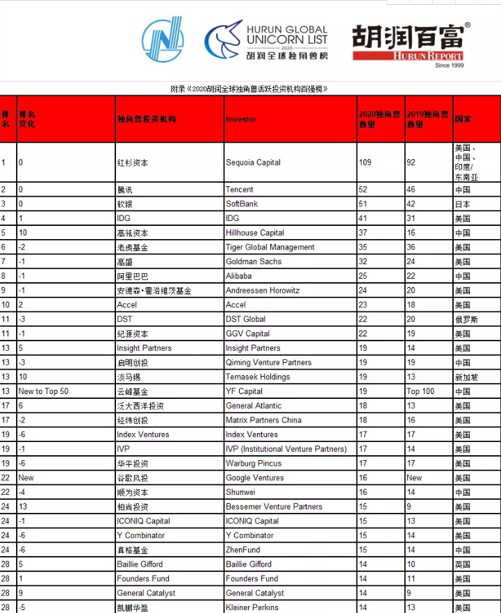以下为《2020胡润全球独角兽活跃投资机构百强榜》(来源:“胡润百富”公众号):