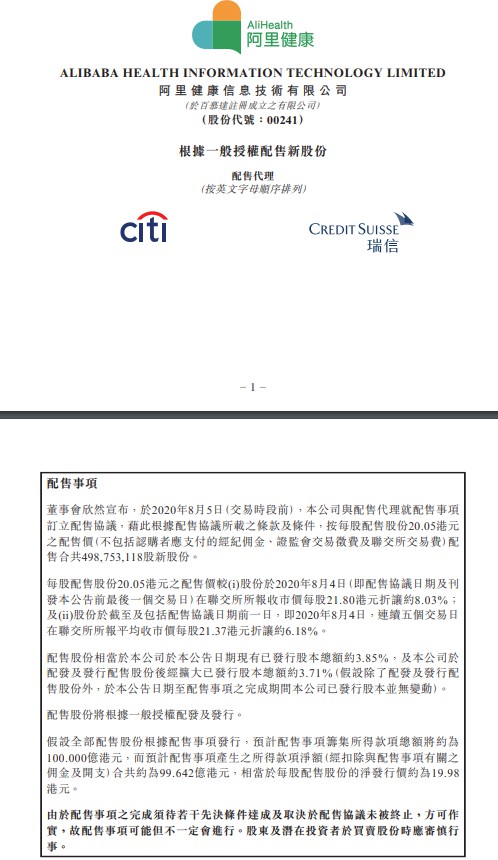 8月5日消息,阿里健康公告称,于2020年8月5日(交易时段前),本公司与配售代理就配售事项订立配售协议,按每股配售股份20.05港元之配售价配售合共498,753,118股新股份。