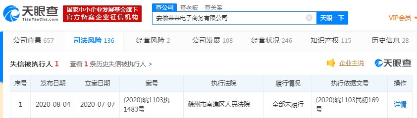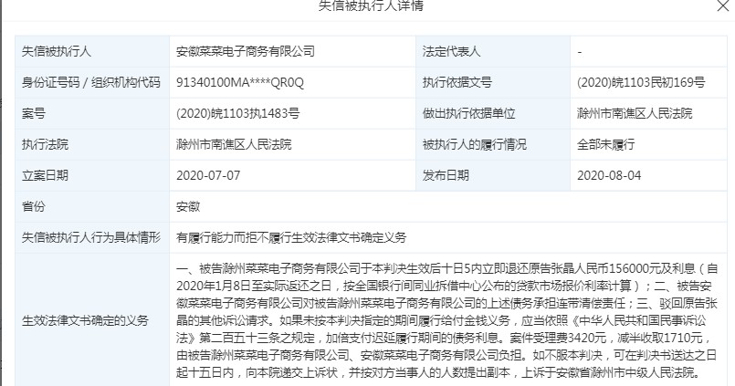 8月5日消息,天眼查数据显示,近日,安徽菜菜电子商务有限公司新增一条失信被执行人信息,发布日期为2020年8月4日,执行法院为滁州市南谯区人民法院,执行情况为全部未履行,失信被执行人行为具体情形为“有履行能力而拒不履行生效法律文书确定义务”。