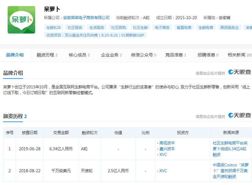 天眼查资料显示,安徽菜菜电子商务有限公司成立于2015年10月,注册资本500万,法定代表人为李阳,经营范围包括电子商务信息咨询;初级农产品、预包装食品、散装食品的销售(含网上);货物配送服务;第三方物流服务及物流信息咨询等。该公司拥有项目品牌“呆萝卜”。