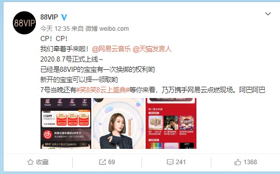 这是网易云音乐与阿里体系业务首度进行战略合作,网易云音乐也成为阿里体系外首个与88VIP战略合作的互联网产品。据《电商报》了解,8月7日0点起,88VIP新用户和老用户均可在其会员主页领取黑胶VIP权益,登录网易云音乐后即可享受会员体验。