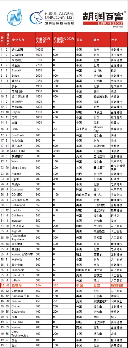 蓝鲸教育8月6日讯,日前,胡润研究院发布《2020胡润全球独角兽榜》,猿辅导在线教育再次上榜,以500亿元估值位列全球第35名,较2019年度提升49名,于中国在线教育行业中位居首位。