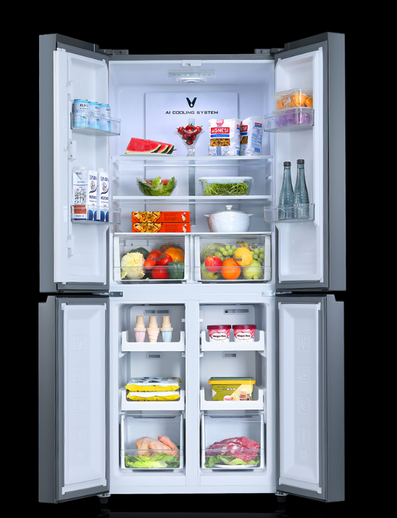 云米十字四门冰箱4大优势,15大存放分区,合理有序方便拿放,果蔬、雪糕、冻肉、熟食、饮料都有,独立存放的空间,食材分类精细化存放,打开门就能直,接取出想要的东西,科学分区整洁有序。超宽冷藏室东西大也能放,3层650mm加宽冷藏室,中间无隔断,轻松放入大蛋糕、披萨、西瓜等大尺寸食材;隔架可拆卸,根据高度需要可随意调节搁架位置,保鲜食材更灵活方便。冷冻分区不混装,食材分类精细存放,4格开放式托盘和2个密封抽屉两种冷冻室组合,开放式托盘可存放速冻饺子、面点类食材,方便拿放;冷冻抽屉可分别存放干货和冻肉,避免生熟串味。独立四开门,按需打开减少冷气流失,十字四门多空间结构的冰箱,不同食材都有独立存放的空间,只需单开一门取放所需食材,可避免大范围冷气流失,方便又省电。