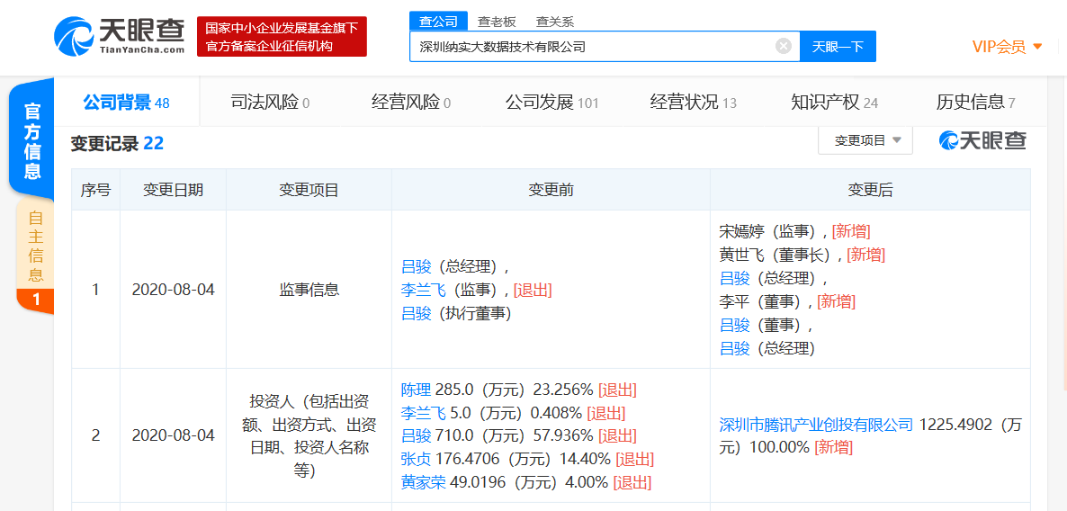 DoNews 8月10日消息(记者 刘文轩)天眼查信息显示,近日,深圳纳实大数据技术有限公司发生工商变更,吕骏、陈理、张贞等原投资人退出,新增深圳市腾讯产业创投有限公司为投资人,持股100%。而深圳市腾讯产业创投有限公司则由深圳市腾讯产业投资基金有限公司100%持股。
