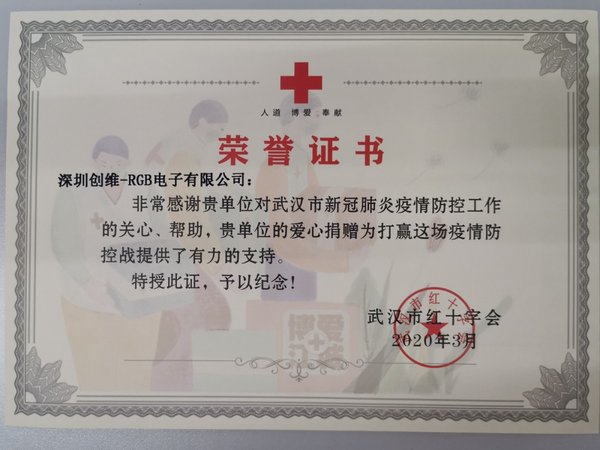 近日,深圳创维-RGB电子有限公司获得了武汉市红十字会颁发的荣誉证书,感谢创维电视驰援武汉,对武汉市新冠肺炎疫情防控工作的关心和帮助,为打赢这场疫情防控战提供了有力的支持。