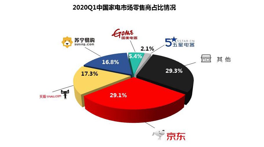 据中国电子信息产业发展研究院发布的《2020年中国家电行业第一季度报告》显示,2020年第一季度,我国家电市场零售额规模达1204亿元;电商渠道对家电零售的贡献率达到55.8%,其中天猫+苏宁易购组合占比接近36%,位列第一,京东与国美组合约为24%。