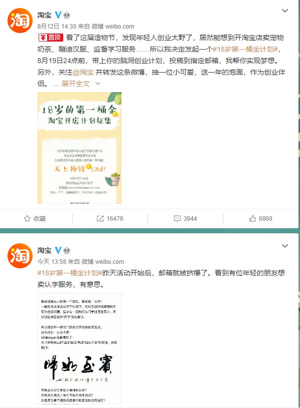 淘宝数据显示,开店计划征集大赛启动后首小时,投稿邮箱就收到了63份开店方案。有中年脱口秀演员要来卖段子,有别出心裁地想出售回忆的95后大男孩,有想开JK制服店的00后“三坑迷”,还有网友向淘宝发来一首诗歌,因不符合参赛规则而自动落选。