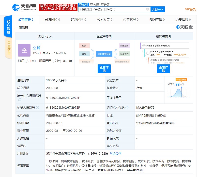 8月13日消息,天眼查显示,8月11日,阿里巴巴(宁波)有限公司成立,法定代表人为仝腾,注册资本1亿人民币,经营范围包括网络技术服务;软件开发;信息技术咨询服务;技术服务、技术开发等。股东信息显示,该公司由阿里巴巴(中国)有限公司全资控股。