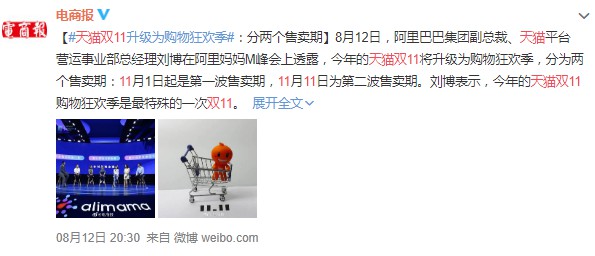 8月12日,阿里巴巴集团副总裁、天猫平台营运事业部总经理刘博在阿里妈妈M峰会上透露,今年的天猫双11将升级为购物狂欢季,分为两个售卖期:11月1日起是第一波售卖期,11月11日为第二波售卖期。