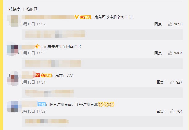 而由于阿里巴巴注册这家的新公司名字惹人联想,消息传出,不少网友因此调侃,“京东要不要注册个淘宝宝?”还有网友建议“腾讯注册京南,头条注册京北”。