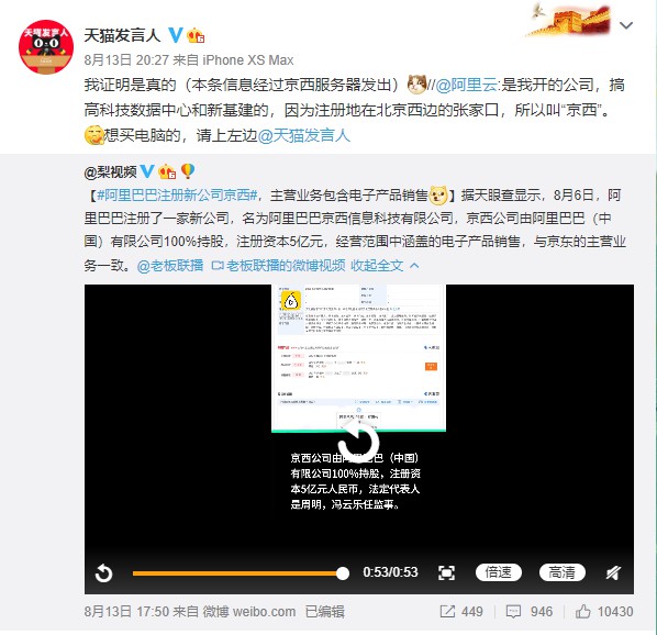 8月14日消息,昨日晚间,阿里云计算官方微博回应成立新公司“京西”:“是我开的公司,搞高科技数据中心和新基建的,因为注册地在北京西边的张家口,所以叫‘京西’。想买电脑的,请上左边@天猫发言人。”
