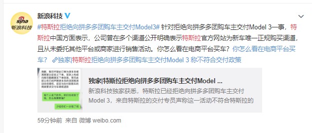 8月14日消息,据新浪科技援引知情人士消息,特斯拉拒绝向拼多多团购车主交付Model 3,原因是该活动不符合特斯拉的交付政策。