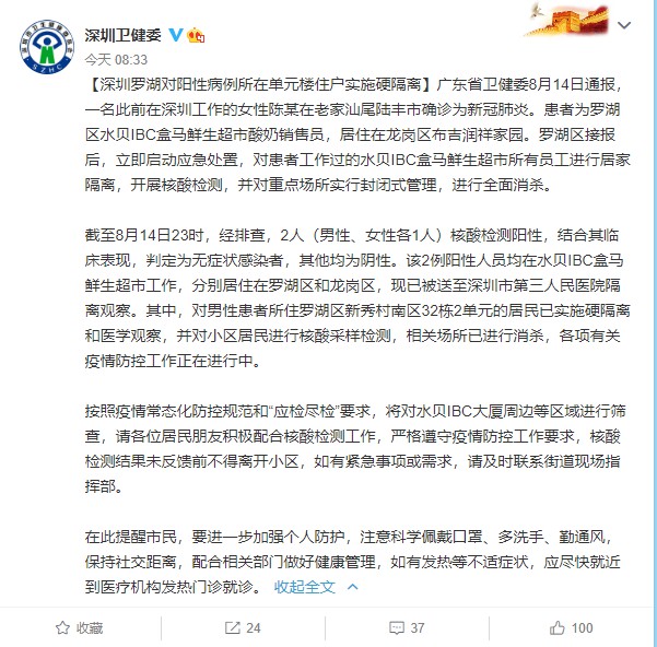 目前,已采集重点人群样本1730份,生活和工作环境样本2140份。经排查,2人(男性、女性各1人)核酸检测阳性,结合其临床表现,判定为无症状感染者,其他均为阴性。该2例阳性人员均在罗湖区水贝盒马鲜生超市工作,分别居住在罗湖区和龙岗区,现已被送至深圳市第三人民医院隔离观察,其所住楼栋的居民已接受医学观察和核酸采样检测,相关场所已进行消杀,各项相关疫情防控工作正在进行中。