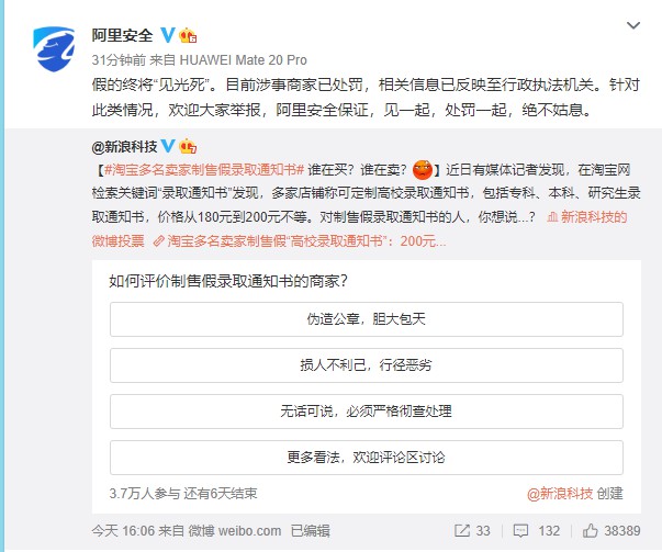 随后,阿里安全回应称,“假的终将'见光死'。目前涉事商家已处罚,相关信息已反映至行政执法机关。针对此类情况,欢迎大家举报,阿里安全保证,见一起,处罚一起,绝不姑息。”
