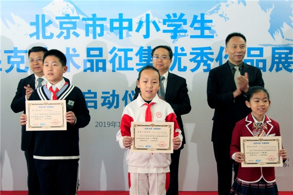 首都体育学院党委书记何明(中)为北京市中小学生奥林匹克艺术品征集活动获奖学生颁奖