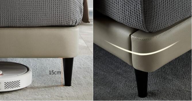 15cm圆柱高脚设计,稳固承托,更方便方床底清洁。弧形防撞转角,内置海绵,防磕碰,贴心呵护。300KG高承重排骨架,九宫格式钢制框架,3.0加厚碳素方钢,受力均衡更稳固经久耐用。