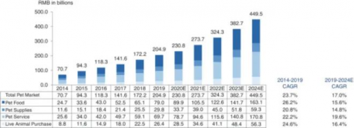 近年来,中国的宠物行业一直在经历着显著的增长。根据Frost & Sullivan预测,中国的宠物数量从2014年的1.896亿只增长到2019年的3.021亿只,预计到2024年将进一步增加到4.455亿只,2019年至2024年的年复合增长率约为8.1%。从收入来看,宠物食品和宠物服务占据了中国宠物行业的大部分。
