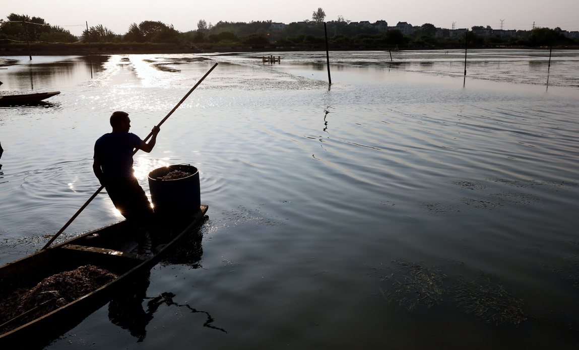 ▲2019年底,陈芸从苏州回到了家乡南京高淳。图为陈芸正在自家蟹塘边准备捞水草。 (安舜 摄)