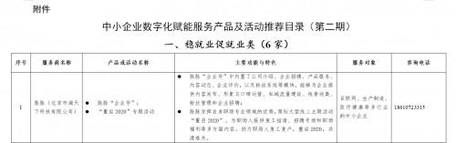 在“推荐目录”中,“稳就业促就业类”共有包括脉脉(北京市淘天下科技有限公司)在内的6家企业登榜。在战疫期间,脉脉的“企业号”和“重启2020活动”,持续为互联网、生产制造、医疗健康等多行业的中小企业进行数字化赋能。