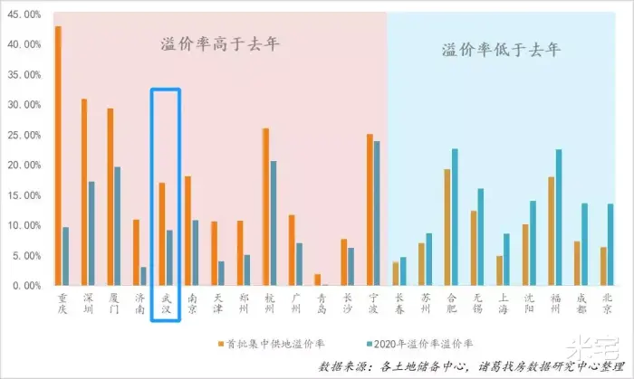 从溢价率来看,武汉首批集中供地溢价率为17%,高出去年同期至少有7个百分点。