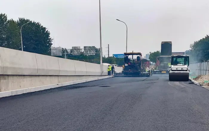 ■ 项目主桥通车后,各参建单位不畏酷热、连续作战,克服交通组织难度大、交叉施工等难题,在确保安全、质量的前提下,抢进度、赶工期,全面优化施工工艺流程和施工组织设计,共完成2.57万平方米路面刨铣、2.57万平方米沥青铺装、3.35千米路沿石铺装施工,超时间节点实现辅路通车。