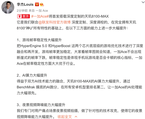 4月18日,一加手机公布新品一加Ace将搭载独家定制的天玑8100-MAX芯片,在游戏性能、AI计算能力、夜景拍摄迎来突破。